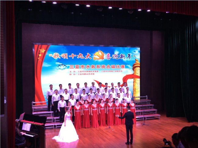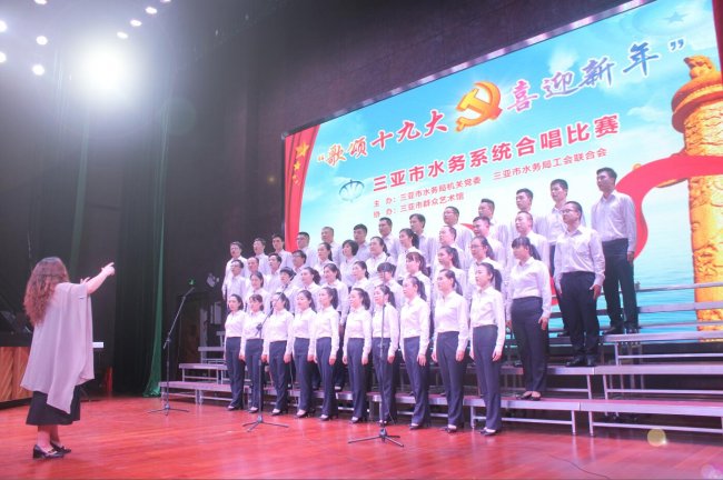 此次比賽,是為了慶祝黨的十九大勝利召開,迎接2018年元旦,唱響時代主旋律,弘揚社會正能量,展現(xiàn)水務(wù)系統(tǒng)職工的精神面貌。針對此次比賽,我司特別邀請了三亞音樂家協(xié)會副主席、三亞愛樂合唱團指揮王雙老師擔任此次專業(yè)指導(dǎo)和現(xiàn)場指揮。當晚,水務(wù)系統(tǒng)共9支隊伍參加了比賽,整場演出喜慶熱烈,節(jié)目精彩紛呈。我司合唱團演唱的第一首歌曲《祖國不會忘記》唱出了水業(yè)人不忘初心的精神氣質(zhì),表達了我們愛崗敬業(yè)、團結(jié)奮進的水業(yè)精神。第二首歌曲《在燦爛的陽光下》則抒發(fā)了我們愛黨、愛祖國的深厚情懷,合唱團團員們精神飽滿、充滿激情、意氣奮發(fā)、放聲歌唱,把對偉大祖國的熱愛,對黨的忠誠,對崇高理想的追求,都融入到深情的歌聲中。